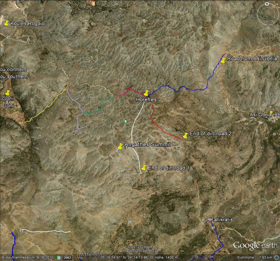 has anybody ever done the walk from Goni on Askifou plateau to Asi Gonia or Kallikratis via Horeftes. It is shortly (but to my opinion absolutely incompletely) described in the L. Wilson`s book. The first section to Horeftes mitato is more or less clear (and visible in Google Earth) but the connection towards the dirt road which comes up from Asi Gonia as well as the connection to Kallikratis via Angathes summit is completely mysterious for me.
