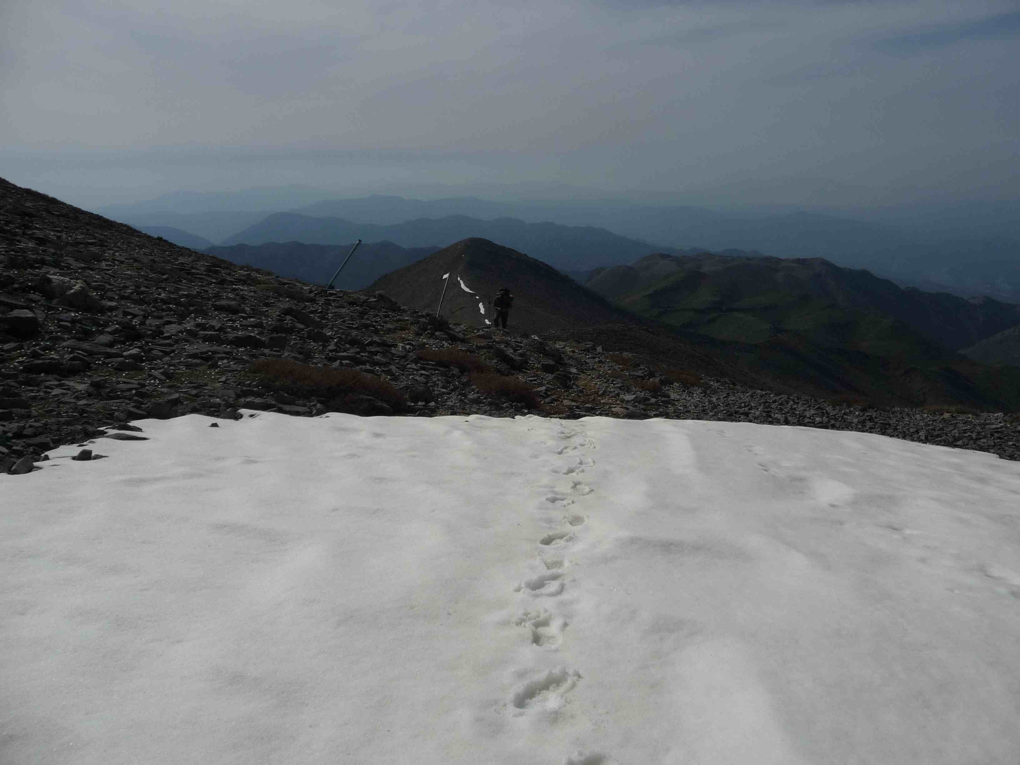 Am zeitigen Vormittag des nächsten Tages erreichten wir die Volikas Hütte. Wie erwartet war sie verschlossen, aber in frisch gestrichenem und renoviertem Zustand. Wir machten hier ausgiebig Rast und versorgten uns an der nahen und hervorragend gepflegten kleinen Quelle nocheinmal mit Wasser, und folgten dem bis zum Abzweig „Mile“, das muß hier, allerdings nicht zu dieser Jahreszeit, ein beliebtes Wanderziel sein, denn der Weg ist bis hierhin hervorragend markiert. Danach ist bald Schluß mit der Markierung, und ein Pfad ist auch nicht mehr zu erkennen. Wir bahnten uns unseren Weg von einem E4 Pfahl zum nächsten, jetzt schon in Höhe der ersten Schneefelder. Den letzten passierten wir am frühen Nachmittag und ab jetzt verlor sich der Pfad vollends im Geröll. Wir wurden extrem langsam und hätten nach Karte weiterwandern müssen Bis Livada, bzw. Katsiveli war es in diesem Tempo niemals in zwei bis drei Tagen zu schaffen. Wasser war nicht das Problem, Schnee gab es genug, und mit Essen waren wir gewohnt zu sparen, aber die Vorstellung, die nächsten Nächte irgendwo in einer Felsnische zu verbringen behagte uns gar nicht. Da wir begeisterte Bergwanderer sind, aber keine Hasardeure, die sich selbst und andere in Gefahr bringen wollen, beschlossen wir abzubrechen, welches eine weise Entscheidung war, denn es gab, wie wir später erfuhren, noch kein Wasser in Katsiveli und der Weg von Livada weiter nach Chora Sfakion sei sehr schwierig, und erreichten nach einem Schnellabstieg rechtzeitig vor der Dunkelheit unseren gestrigen Lagerplatz in der kleinen Schlucht.