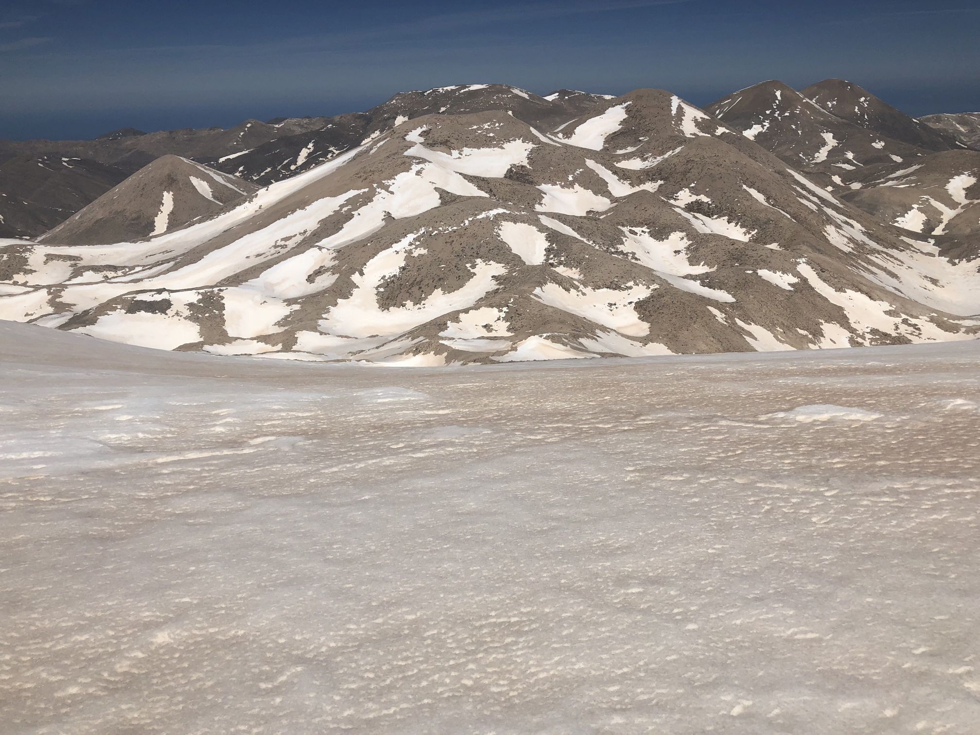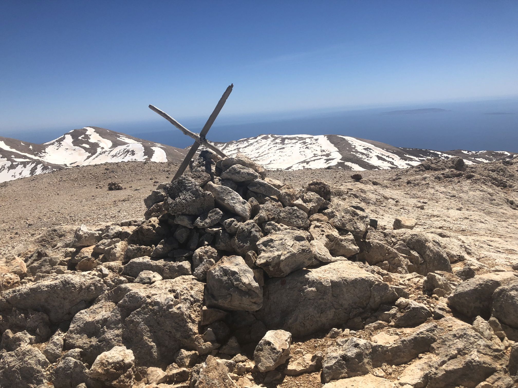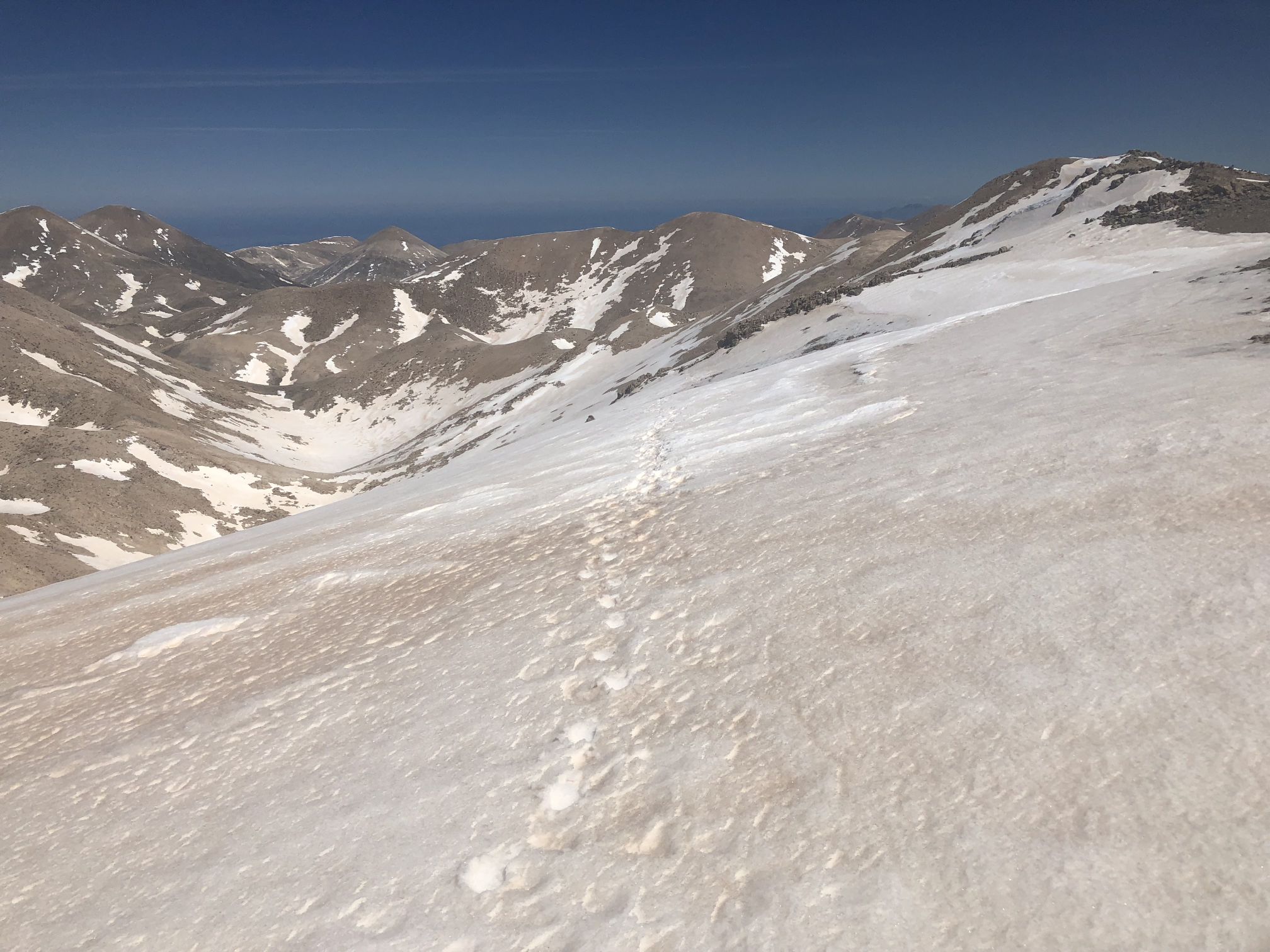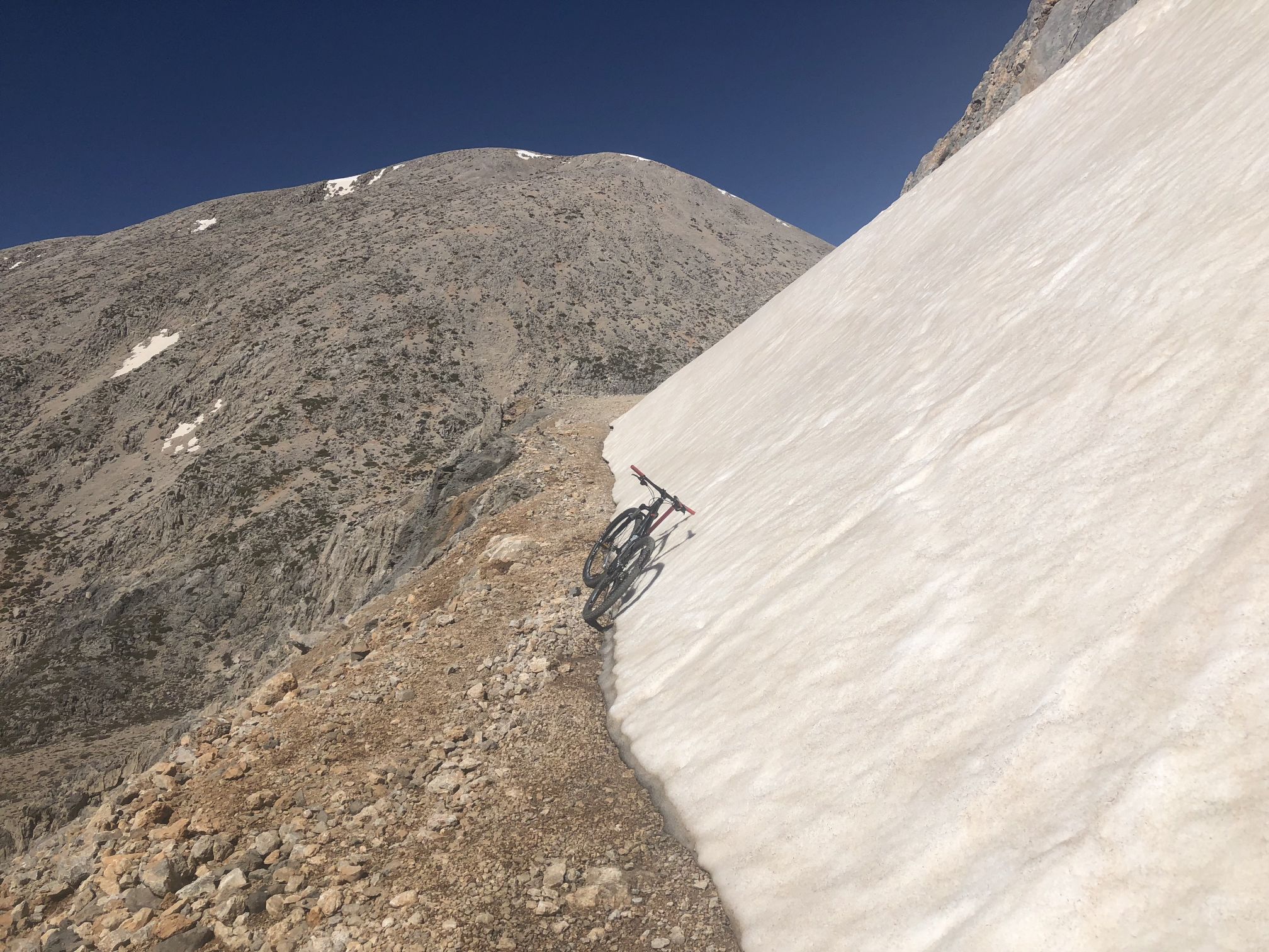 Mit meinem in Chania neu erstandenen Mountainbike radelte ich die lange und sehr steinige Strasse hoch bis fast Roussies - ein paar Tragepassagen wegen Schneefeldern, die da und dort die Strasse noch bedecken. Ab Roussies angenehm - vom kleinen Pass aus, von dem aus man den Gipfel des Pachnes zum erstenmal sieht, fast durchgehend im Schnee; das ging in meinen Veloklickpedalschuhen aber problemlos, weil man kaum einsank. Hübsche, aber lange bike&hike-Kombitour, fast 2000 Höhenmeter ab Anopoli.