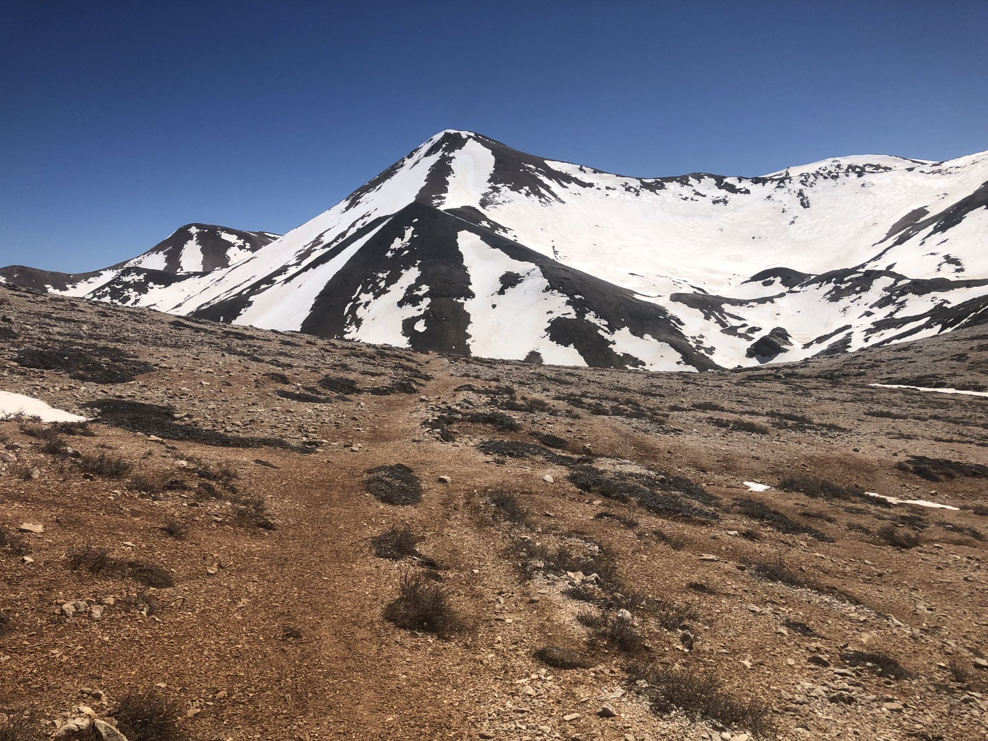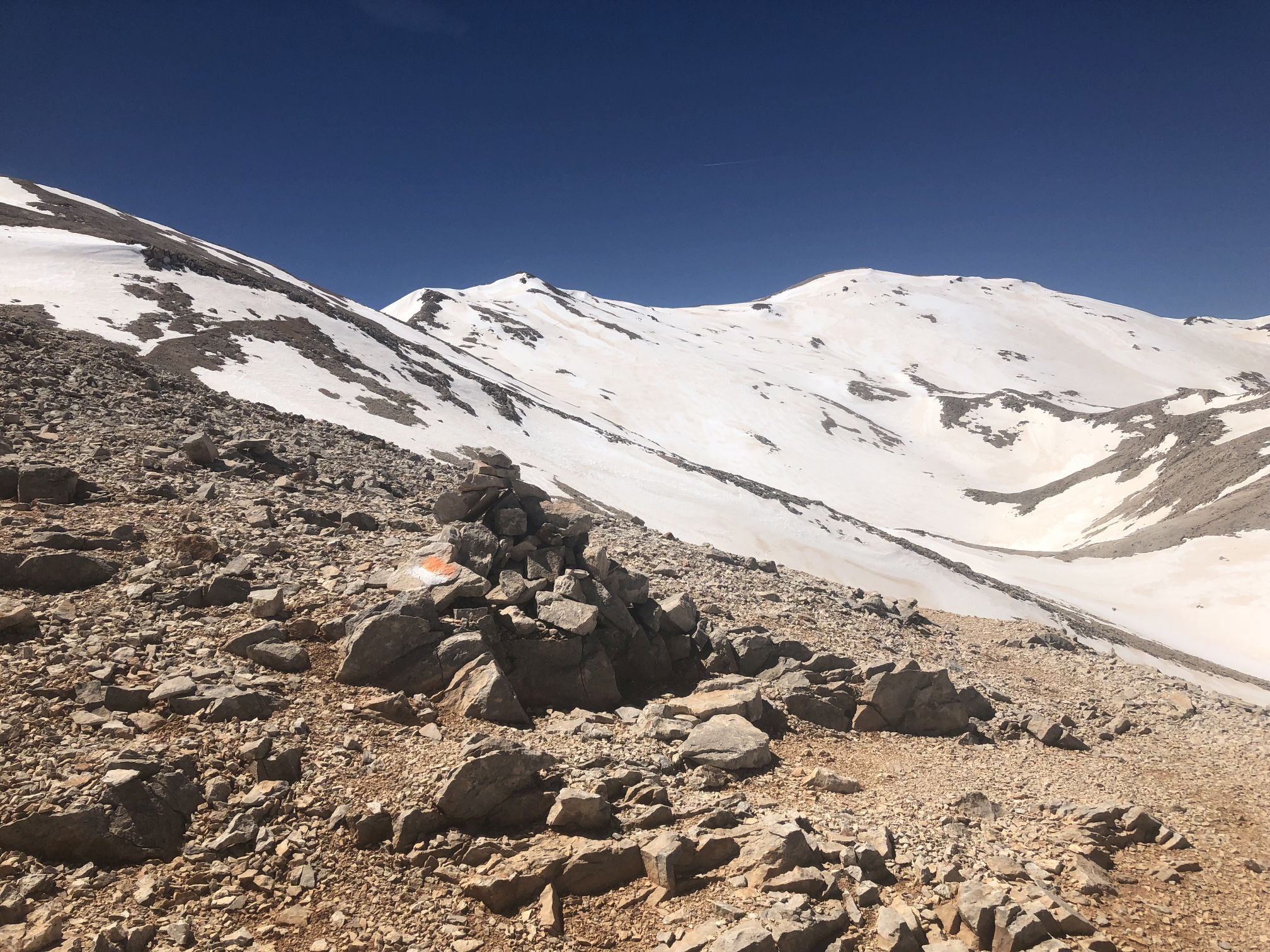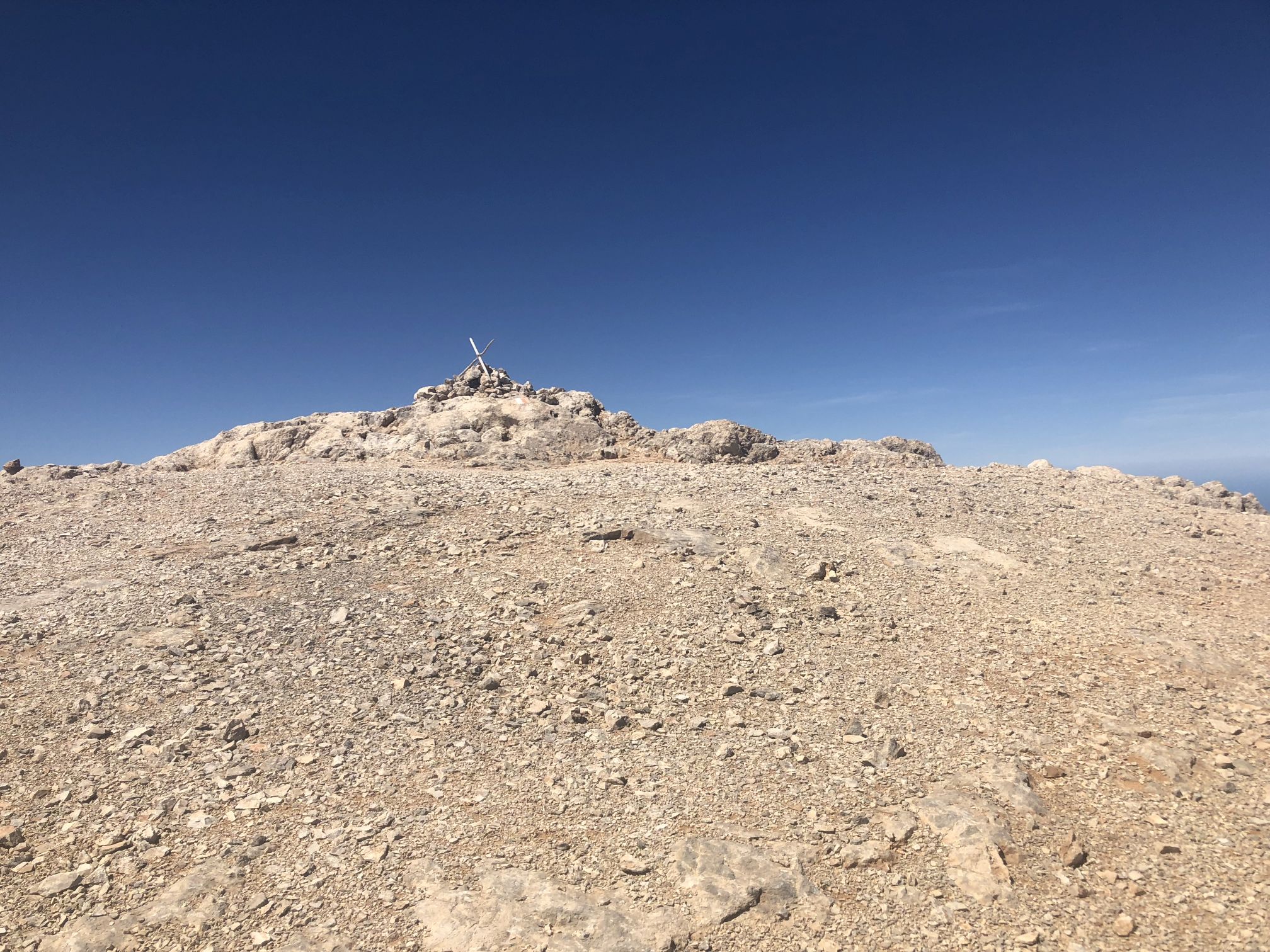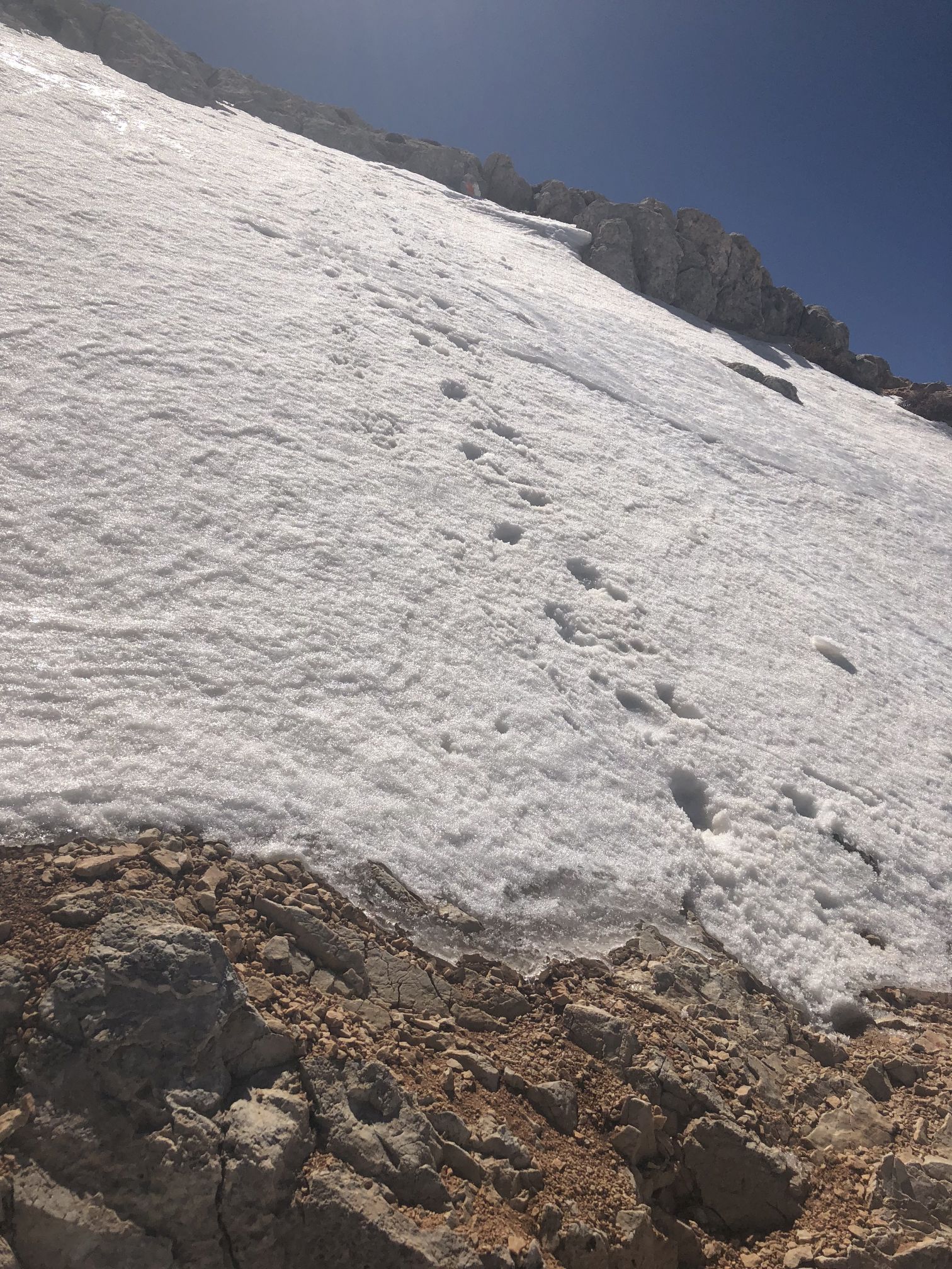 Mit meinem in Chania neu erstandenen Mountainbike radelte ich die lange und sehr steinige Strasse hoch bis fast Roussies - ein paar Tragepassagen wegen Schneefeldern, die da und dort die Strasse noch bedecken. Ab Roussies angenehm - vom kleinen Pass aus, von dem aus man den Gipfel des Pachnes zum erstenmal sieht, fast durchgehend im Schnee; das ging in meinen Veloklickpedalschuhen aber problemlos, weil man kaum einsank. Hübsche, aber lange bike&hike-Kombitour, fast 2000 Höhenmeter ab Anopoli.