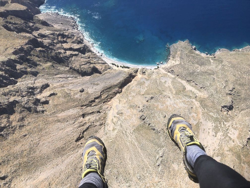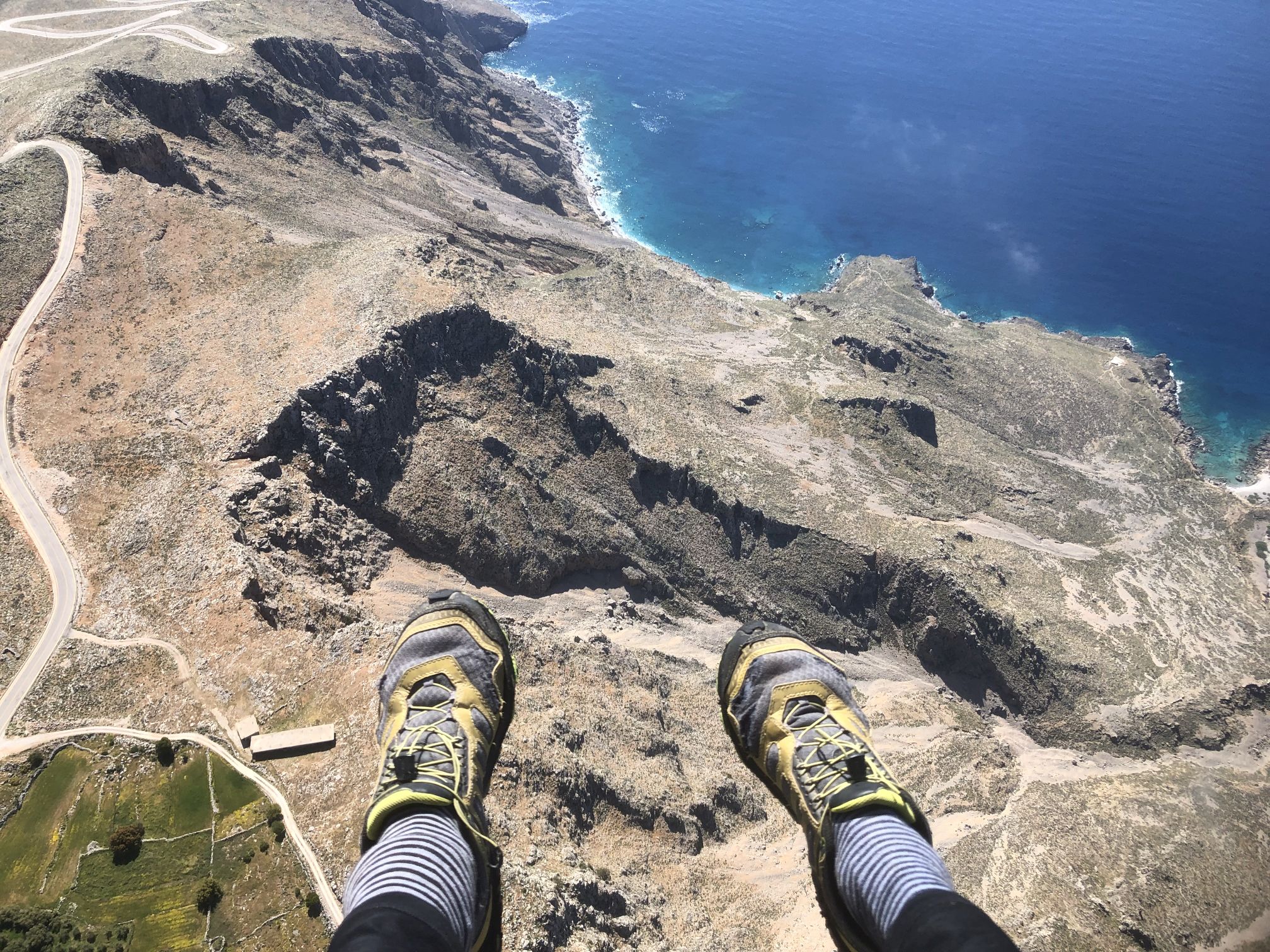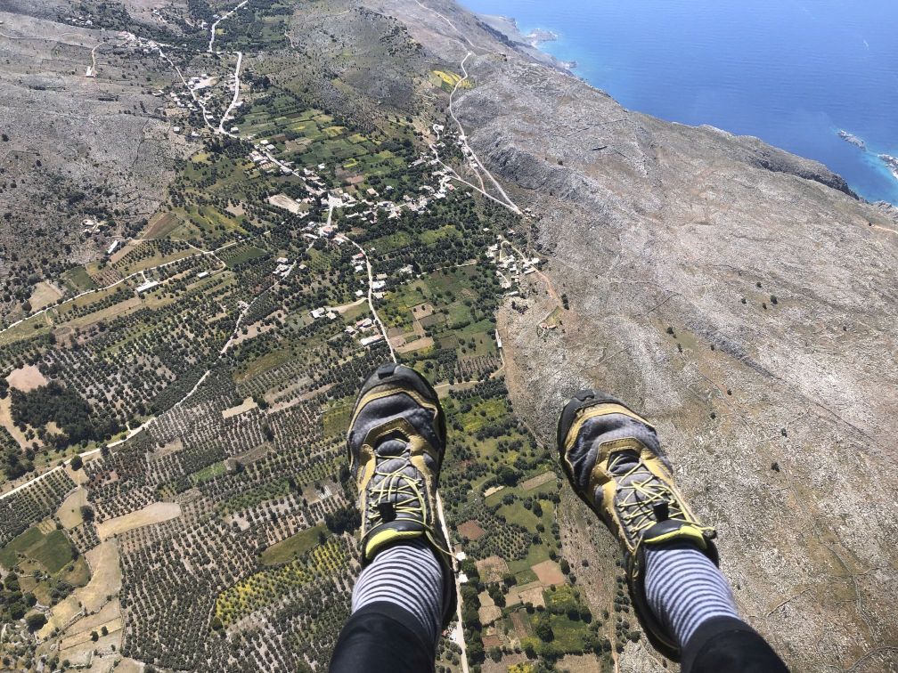 Yesterday at 6 o'clock I started at Anopoli from my room of the baker's Giannis on the road direction Roussies-Pachnes. At Gonia I left it and took the old mulepath directly to Agathopi (where by the way snow stops trucks now! At 1400 m). There I turned left, rather planty first, but stable and very rough rock, easy to go, beside of some very loose stone-passages, towards Chorafas Korfi. From there quite a long traverse, about 2 kilometers, up an down, avoiding big sink-holes, but wihtout gaining almost any height, brings you to the final slopes to Thodori Korfi. The whole ascent took me 3 1/2 hours (but be aware - an average hiker needs for that certainly 6 hours). At the top I waited at my old, prepared, yet stony starting point almost an hour for better winds - and then went, just to do something against boreness, forty meters to the left around the top ---- and found a super, yet small snowfield, that I did not see from beneath. There the wind was coming directly upwards: perfect! I installed my harness, fixed my iPhone at it, put the glider on the snow - while opening it piece by piece, I covered it on its downside every meter with a small pile of snow, to avoid, that it gets blown away or turn around and makes a mess in my thin lines. At 10.30 exactly I pulled the lines of my glider with the completely certain feeling, that there were no problems at all - a perfect, relaxed start on that flat snowfield. One or two steps later I was in the air, I joodeld even before taking off... I did four telephone-calls during the flight, to announce my local friends from Anopoli, that I am in the air, in case they wanted to watch me flying above the village - till Anopoli you fly almost 8 km completely straight, you don't need to have your hands on the brakes. Flying half a kilometer above the church of Agia Ekaterini, I saw Nera Glyka - very exposed, incredibly nice to have such a view, that you never have, if you do not see it from the air. Half an hour after the start my incredibly panoramic flight was over - I landed smoothly in very calm conditions at the astonishlingly empty Sweet-Water-Beach. Jorgos from the taverna took a film of the last two minutes of my flight. I have also made some nice films - but do not know how to upload them here...