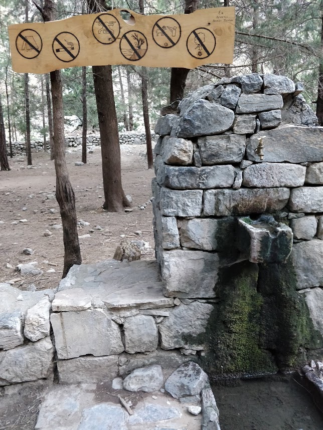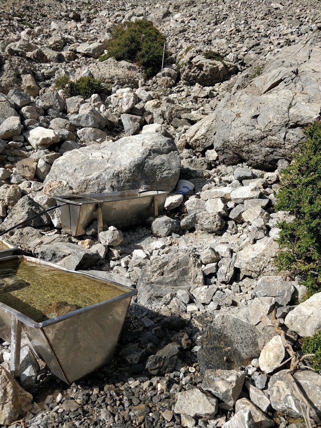Vorbei an der Linoseli-Quelle, die sich in drei verbundene Ziegentränken ergießt, wo man aber von der ersten gut den Schlauch abheben und das Wasser in die eigene Flasche umleiten kann: