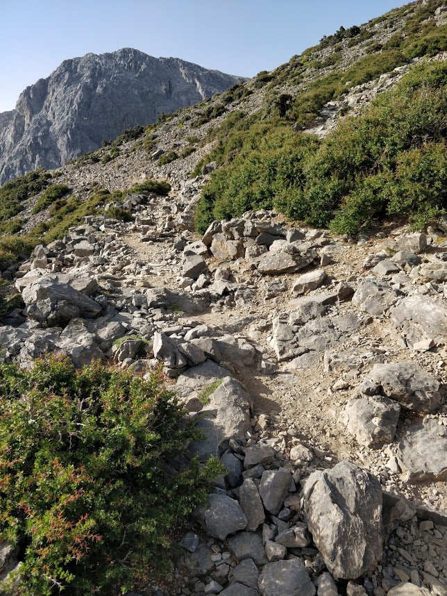 Das es noch ziemlich früh war, und ich nur einen 2kg-Tagesrucksack mit Wasser, Sonnencreme und Erste-Hilfe-Set auf dem Rücken hatte, wollte ich vom Sattel noch den E4 Richtung Koustogerako ein Stück weit auskundschaften, um zu sehen, ob ich mich trauen würde, hier mit Gepäck abzusteigen. Kurzer Blick aufs Handy auf die Anavasi-App -ah, hier lang gehts. Aber nur 2 Minuten, dann stand ich orientierungslos im Hang ... Wirklich schwer zu finden, der Einstieg. Zum Glück hatte ich auf dem Sattel vorher eine deutsche Wandergruppe getroffen, und denen von meinem Plan erzählt. Die beobachteten dann vom Sattel aus zunächst interessiert meine Bemühungen, und als ich nur noch orientierungslos rumstand, hat mich einer lautstark dirigiert, "da hoch", "weiter links", usw. usw., das nächste E4-Schild konnte er vom Sattel aus immer erkennen, ich aus dem Hang aber nicht...