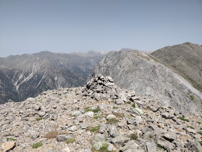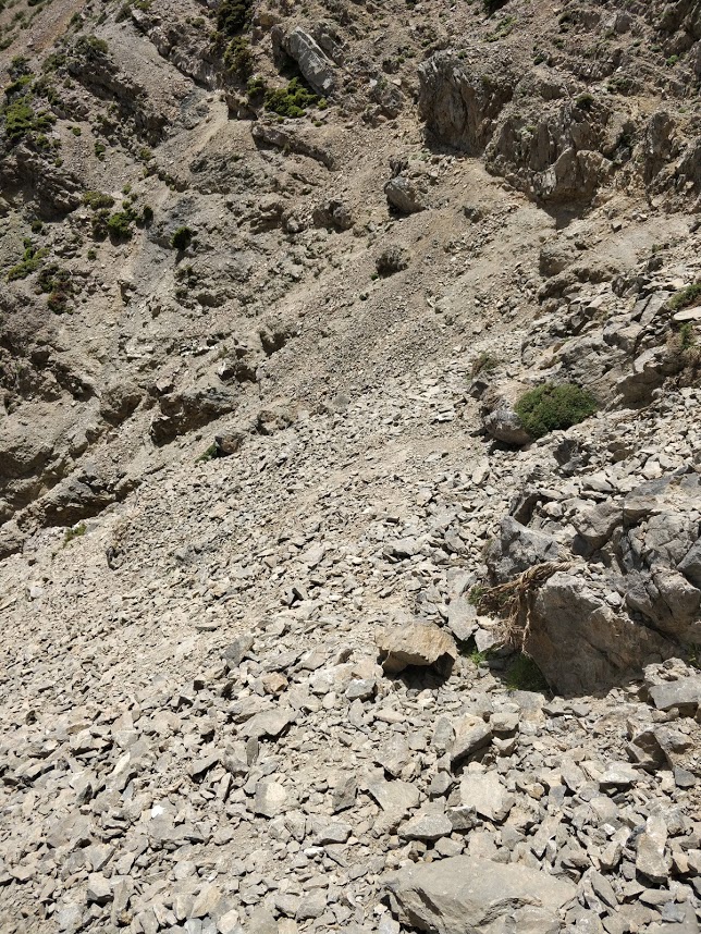 Ab hier hab ich wieder keinen Weg mehr gefunden und wollte schon umkehren, dann bin ich ein Stück zurück und hab mir den Hang nochmal von weiter weg angesehen, und dann wurde mir der Weg klar. Also weiter... Nun war ich fast an der Stelle, wo die Umgehung über den Strifomadi auf den Weg trifft, und ich habe beschlossen, darüber zurückzulaufen. Also den Einstieg gesucht ... keine Chance. Ich bin bestimmt 15 minuten links und rechts gelaufen, Blick auf die Anavasi-App, Blick auf Oruxmaps mit dem Track aus dem Forum ... also ich habe keinen Weg gefunden. Also auf Sicht den Hang hoch bis zum Gipfel: