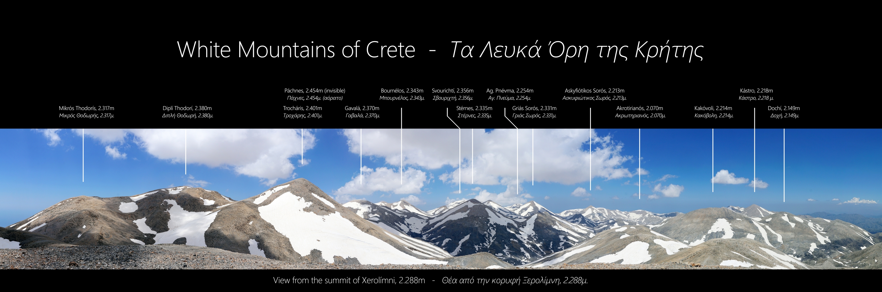 Adding to the argument Alf put forward six years ago about the summits of Xerolimni and Mavro Baloma, I wanted to share with you a panorama I made from what I consider the summit of Xerolimni. The altitude information of EOS Chania (2.288m) roughly corresponded with that of my device (2.291m), so I consider this fairly accurate. Plus I believe my panorama fits the title of this thread "Lefka Ori peaks, names, and locations", so I wanted to share it with you.