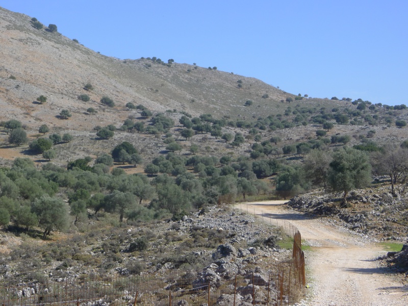 Man verlässt das Dorf Richtung Norden, rechts und links sind Olivenhaine und Weinreben, bis die Straße endet und in eine Schotterpiste übergeht.