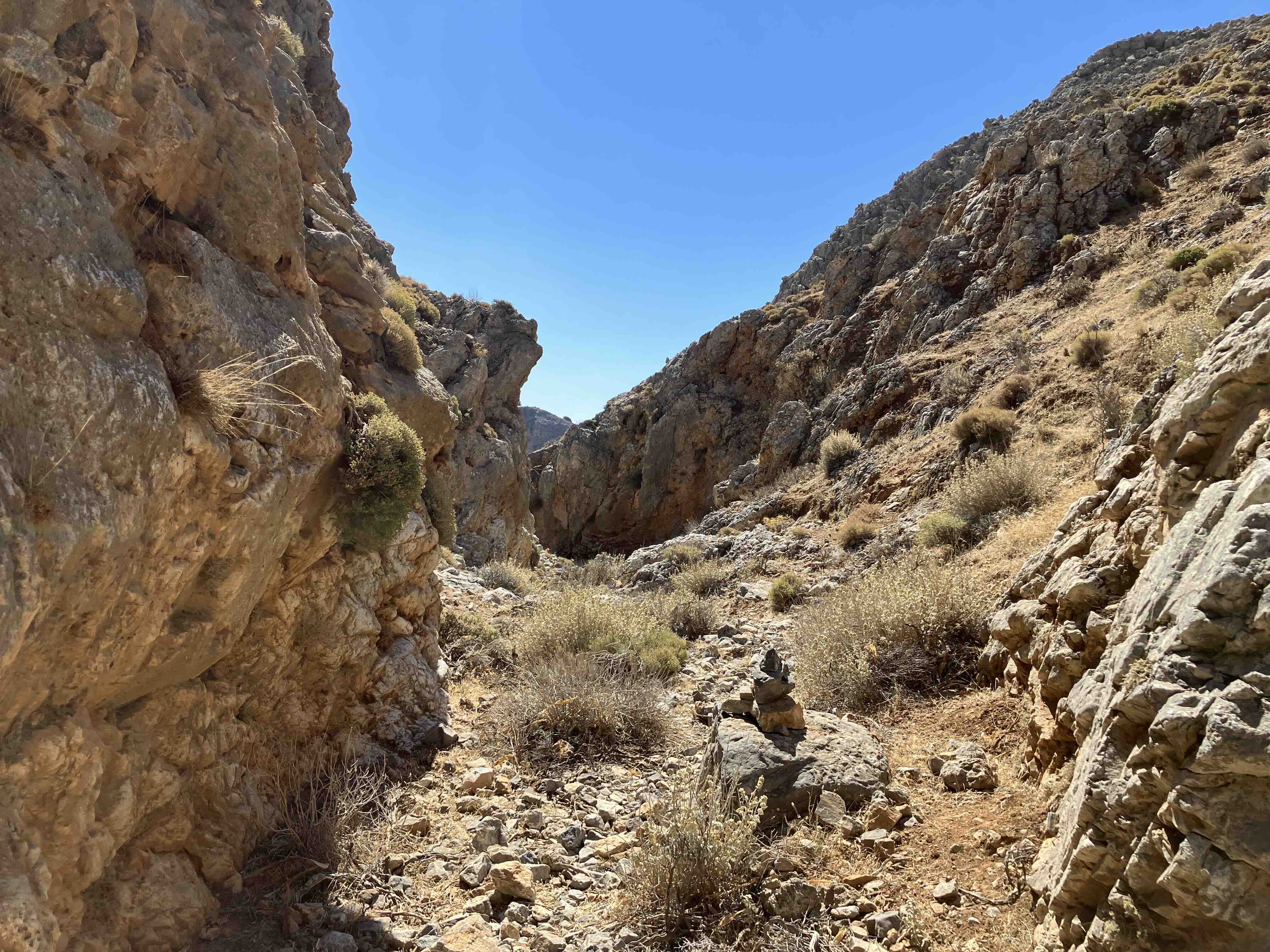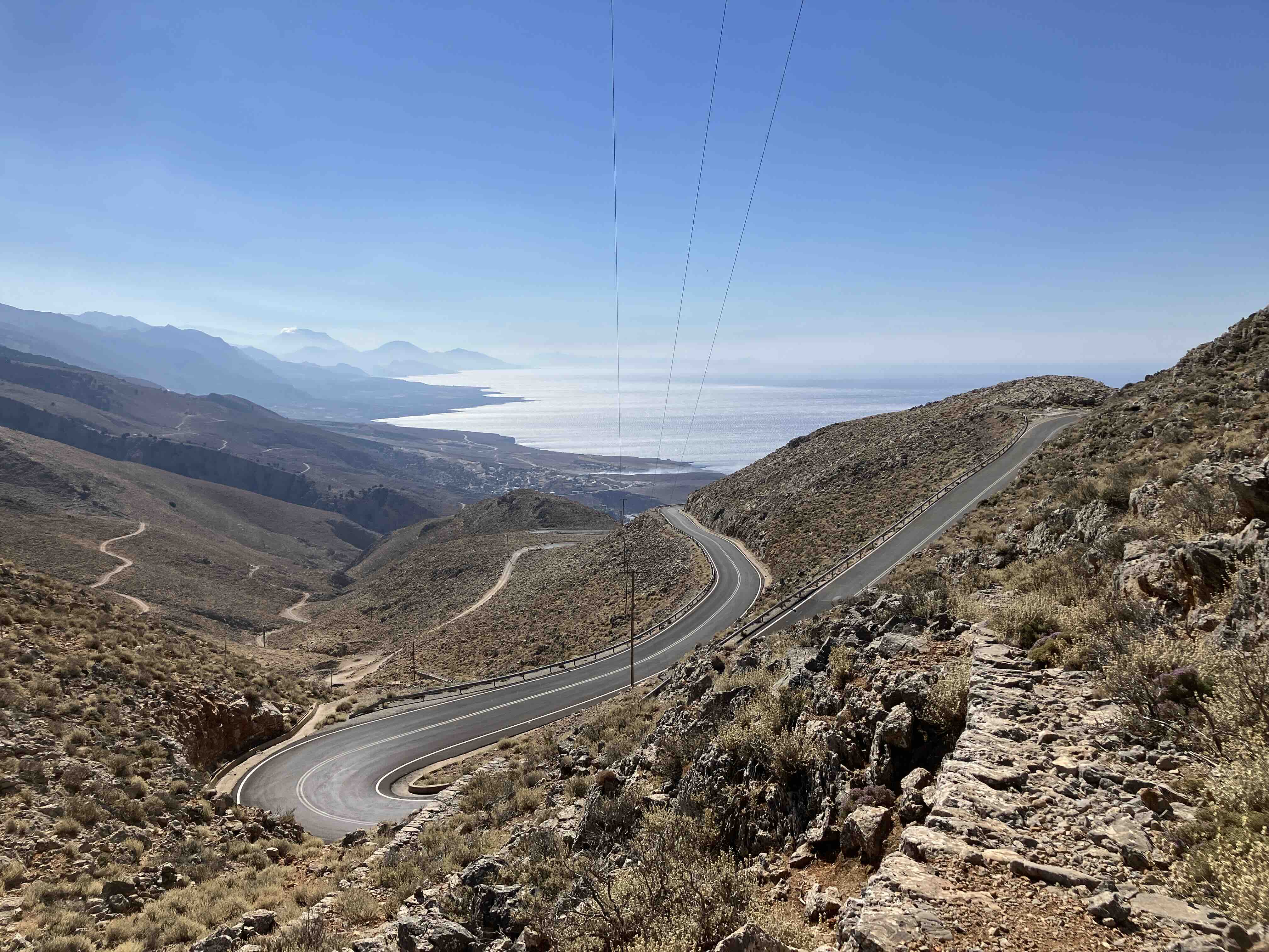 Dieser folgt man geradeaus, zunehmend hangabwärts, vorbei an Autowracks und am Sendemast, bis sich der Ausblick Richtung Chora Sfakion eröffnet. Ab dort wechseln Schotterpiste und alter Kalderimi sich ab. Man quert kurz die Hauptstraße, geht unter der Stromleitung durch und folgt dem kleiner werdenden Weg in die einsame Anopolis-Schlucht.
