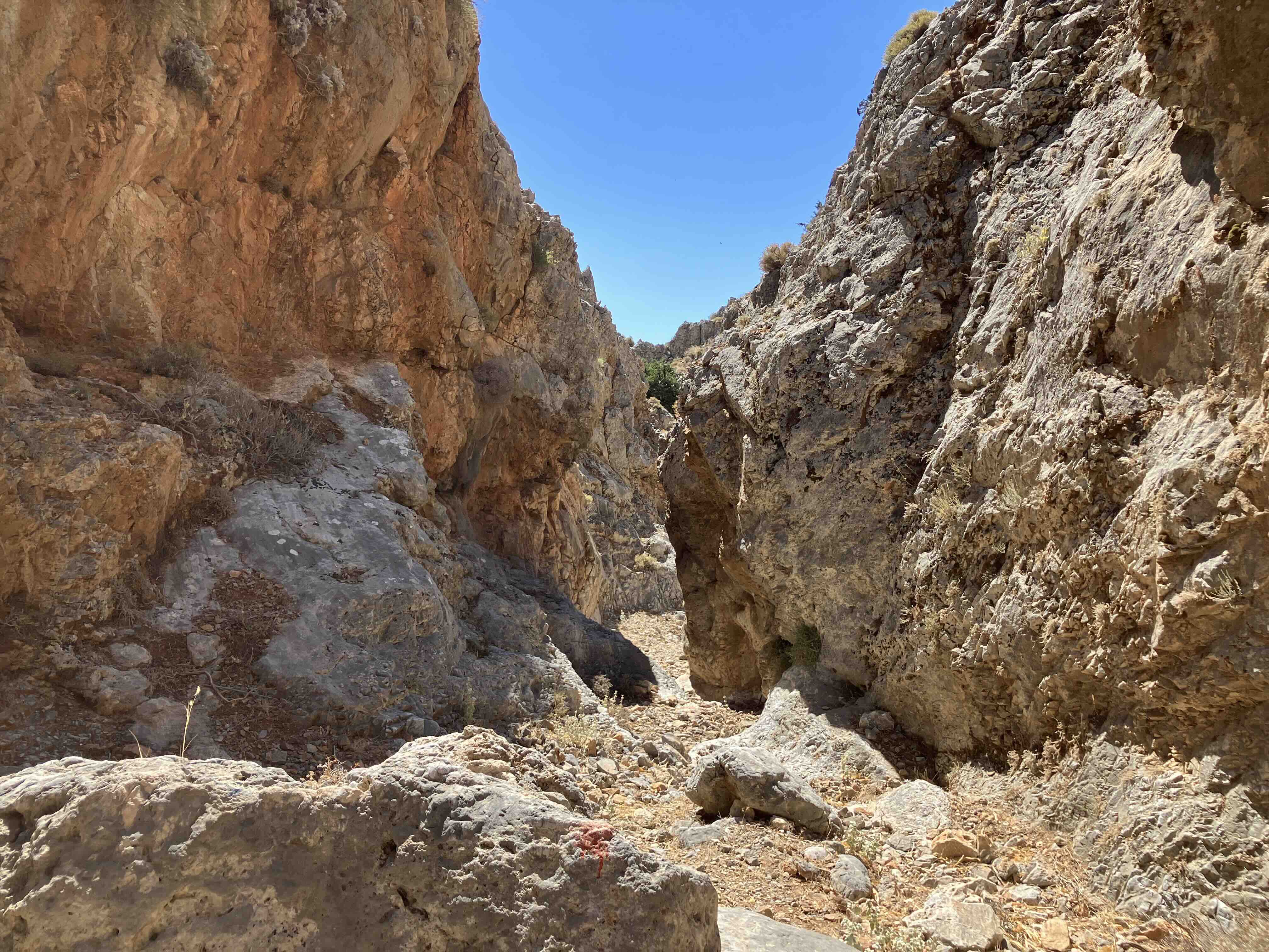 Mir ist zumindest eine Stelle in Erinnerung, an der man kurz die Hände braucht, aber nichts dramatisches. Man folgt der kleinen Schlucht bis diese am unteren Ende mit einem befestigten Steinweg in die Ilingas Schlucht ausläuft, wo man rechts abbiegt Richtung Meer und schließlich die Hauptstraße erreicht. Dieser folgt man ein Stück rechts bis ein kleiner Weg diese Richtung Sweetwater Beach (Glyka Nera) verlässt. Dieser lädt zum Schwimmen ein!