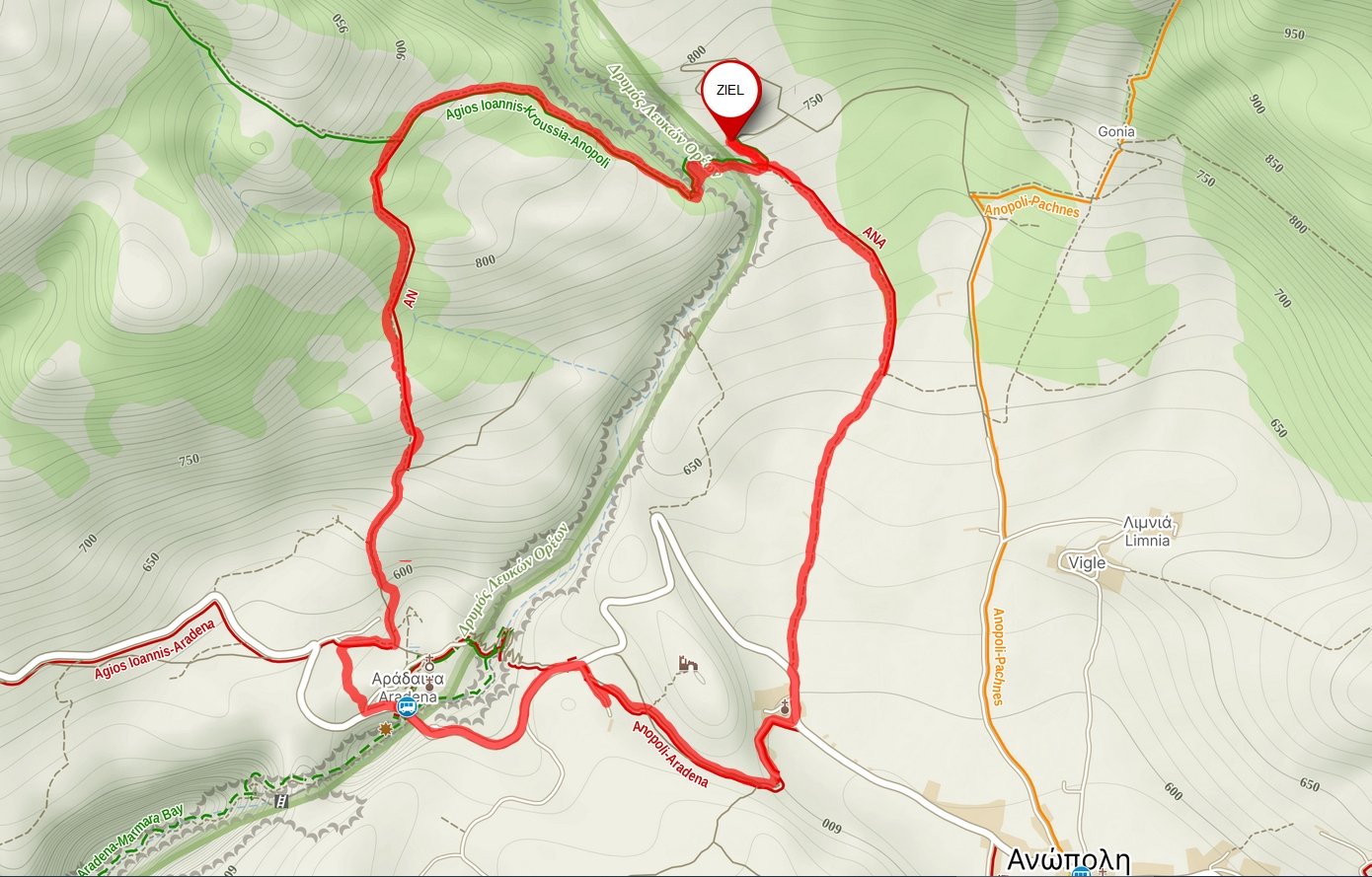 Wer einen Ausspanntag in oder um Anopoli hat, aber trotzdem nicht ganz untätig bleiben möchte, dem sei diese acht Kilometer lange Rundwanderung ans Herz gelegt. Sie führt durch traumhaften Kiefernwald, quert die Aradenaschlucht zweimal (mind. einmal mittels Kalderimi), und bietet sogar Einkehrmöglichkeiten.