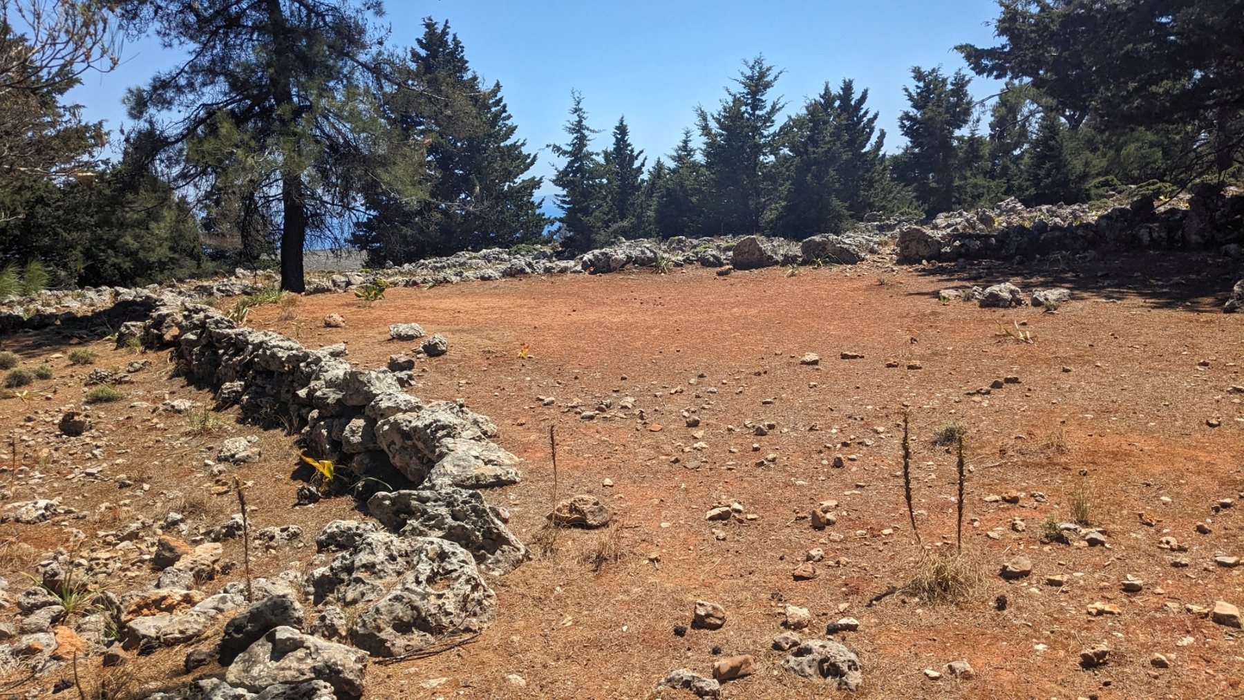 In Ag. Dimitrios kann bei Giorgos Koulieris eingekehrt werden, bevor es hinter dem zerschossenen Ortausgangsschild von Anopoli rechts auf einem Feldweg Richtung Goniá geht (Bild 8 ). Der biegt zwar irgendwann rechts ab, doch führt die Route relativ selbsterklärend zuerst an einem Zaun entlang, später dann mittels Steinmännchen zurück zum Ausgangspunkt.