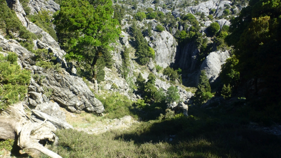 Nach dem ich auf der Niato-Hochebene gezeltet habe, bin ich die Schotterpiste nach Katastromeno gegangen. Nach 20-25 Minuten kommt man an der ersten Zisterne in Katastromeno an. Ein paar Meter vor der Zisterne steht links direkt an der Schotterpiste eine E4-Stange. (Bei der zweiten Zisterne steht auch eine E4-Stange. Hier beginnt der Pfad der von Simon im Mai 2016 neu makiert wurde). Dieser E4-Pfad macht einen leichteren Eindruck.