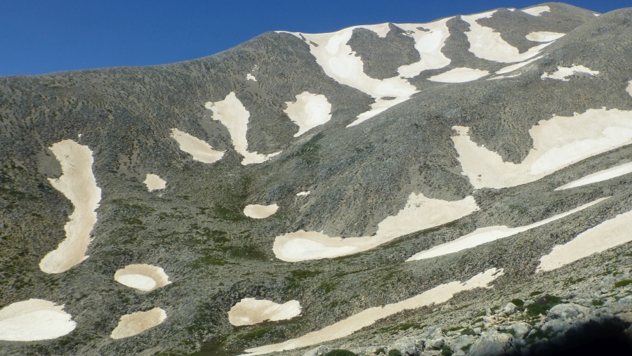 Auf dem schmalen Grat geht es immer weiter bergauf. Links neben dem Grad gibt es die ganze Zeit lange Schneefelder, die zum Teil einige Meter hoch sind. Der Grad selbst ist aber schneefrei gewesen. Einen Weg gibt es hier nicht, man muß immer schauen wo die nächste E4-Stange ist. Alle paar hundert Meter gibt es eine E4-Stange. Es stehen nur noch die grauen Stangen, alle gelben E4-Zeichen sind weg. 2 Stangen sind total umgekniggt. Die Beschaffenheit des Untergrundes würde ich vergleichen mit dem Aufstieg vom Potamos Mitato zum Zaranokefala: download/file.php?id=394&mode=view