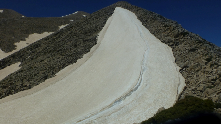 rechts neben dem Schneefeld geht es bergauf