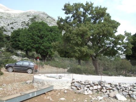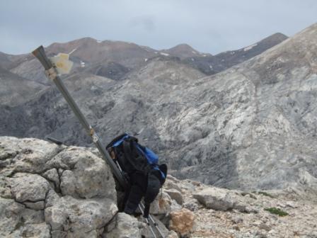 Zunächst war mein Zeitfenster immer kleiner geworden, da der Aufbruch einmal wg. zu starkem Wind und dann auch noch wegen wolkenverhangener Berge verschoben werden musste. Da meine „bessere Hälfte“ bei den Eingehtouren einige Druckstellen und auch Blasen an den Füßen bekommen hatte, wurde umdisponiert: Wir fuhren mit unserem 4x4-Pkw bis zur Zisterne nördlich der Niatohochebene. Die Auffahrt war überhaupt kein Problem, da ist die Schotterstraße zur Kallergiehütte schon ein anderes Kaliber. Dann startete ich alleine (natürlich bodenlos leichtsinnig und absolut nicht zur Nachahmung empfohlen) am 01.06.13 um 10 Uhr in Richtung Katseveli. Rucksackgewicht 15 kg, Bergstöcke, die GPS-Tracks auf dem Navi und mit oft bewährter Bergausrüstung. Mit vielen Pausen für Brotzeiten und zum Fotografieren erreichte ich um 20 Uhr die Katsivelihütte. Landschaftlich war diese Tour grandios, die Einblicke in diese wilde Mond- und Karstlandschaft waren überwältigend und im Gegensatz zum Blick vom Pachnes war man mittendrin statt nur dabei.