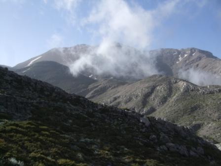 Wegen des weiter sehr starken Windes, der sich beim Anstieg zur Melindaou erneut zum Sturm steigerte, verzichtete ich auf den Gipfel. Der weitere Abstieg war wegen der vielen Steine und Felsbrocken auf dem Weg sehr beschwerlich, auch wegen der Steilheit, rolling stones der unangenehmen Art. Ich war wirklich froh als ich den mir bekannten Fahrweg erreichte und nun zügig ausschreiten konnte. Schon bald kam mir auch meine Frau entgegegen, die zu Fuß zur Kallergihütte aufgestiegen war, die Auffahrt war dem 4x4-Pkw nicht zumutbar.