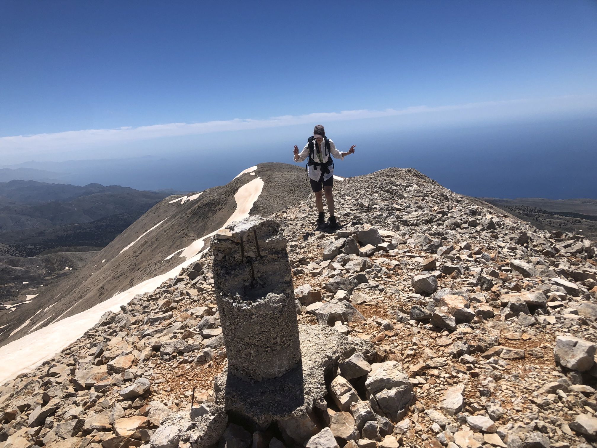 Today at seven o'clock Martina, an austrian lady, that I met here in Anopoli, and I started in direction to the mountains. We went at Gonià up the old mulepath til Agathopi, where car-transport now stops, and continued to Dochi. There are two peaks like Dochi - the second is higher, 2149m. A small descent brings you to the saddle between Dochi and Kakovoli. Another ascent to Kakovoli 2214m - an incredible view opens down to the valley of Mavroi Lakoi and the Kastro-Summits, on the other side all the peaks including Pachnes (which offers certainly a much worse view!) - and both the Libyan AND the Creatan sea. We climbed upwards in the whole this day 1700 m. Descending down SW was just like in a perfect dream: soft snow, but not too soft, not too steep -running or sliding down, like on skis almost, down to the transport-road south to Amouthera. From there nice snow-fields made it very easy again to get to Agathopi, after 7 hours in the whole, from where Manoussos from the Anopoli Taverna brought as back with his car to Anopoli. The conditions in the White Mountains are excellent now - if you know how to move on snow and bring for security reason a light ice axe with you (not necessary though for what we did today!!!!!) . Tommorow I will hike up again, be sure!!