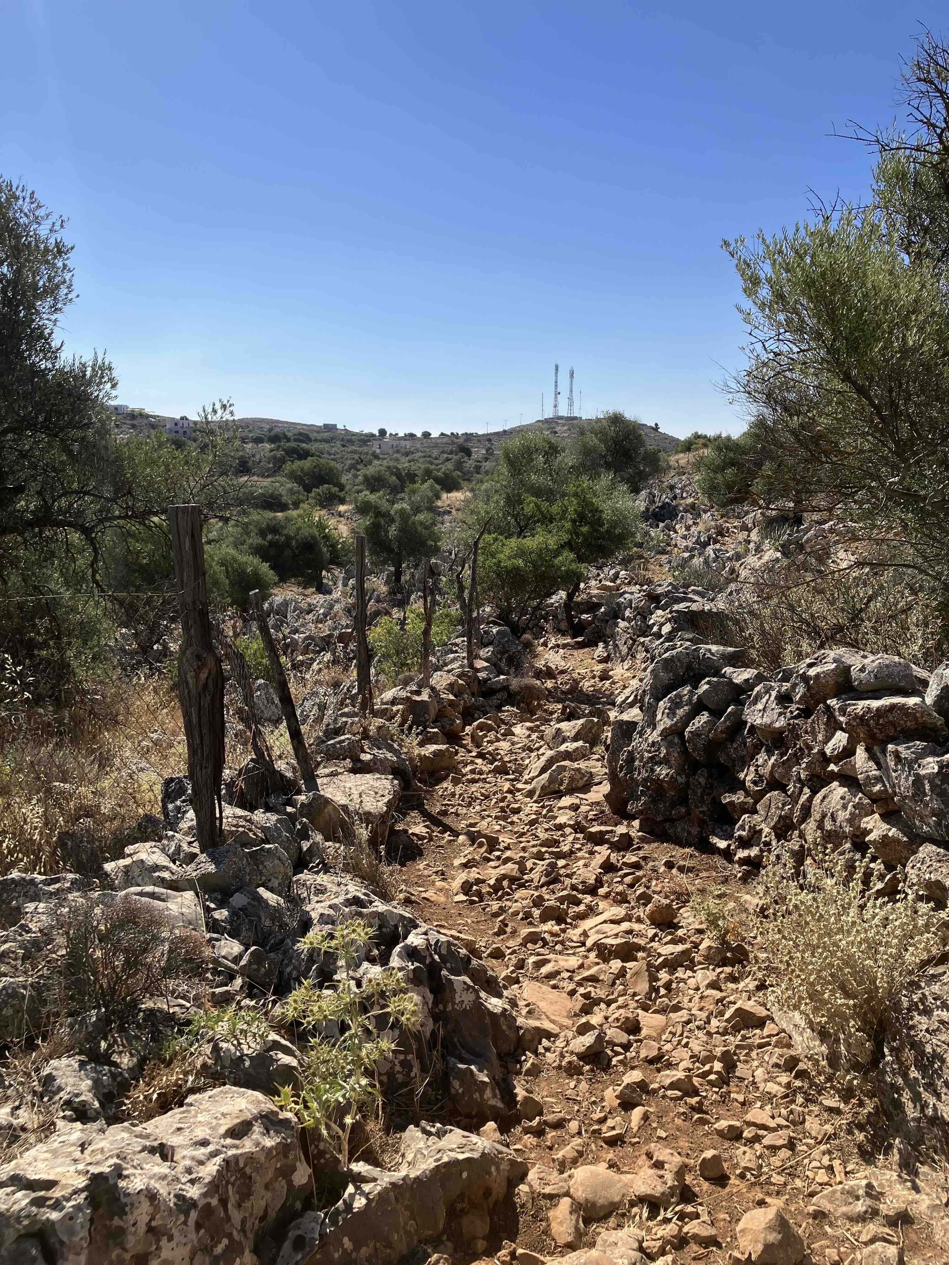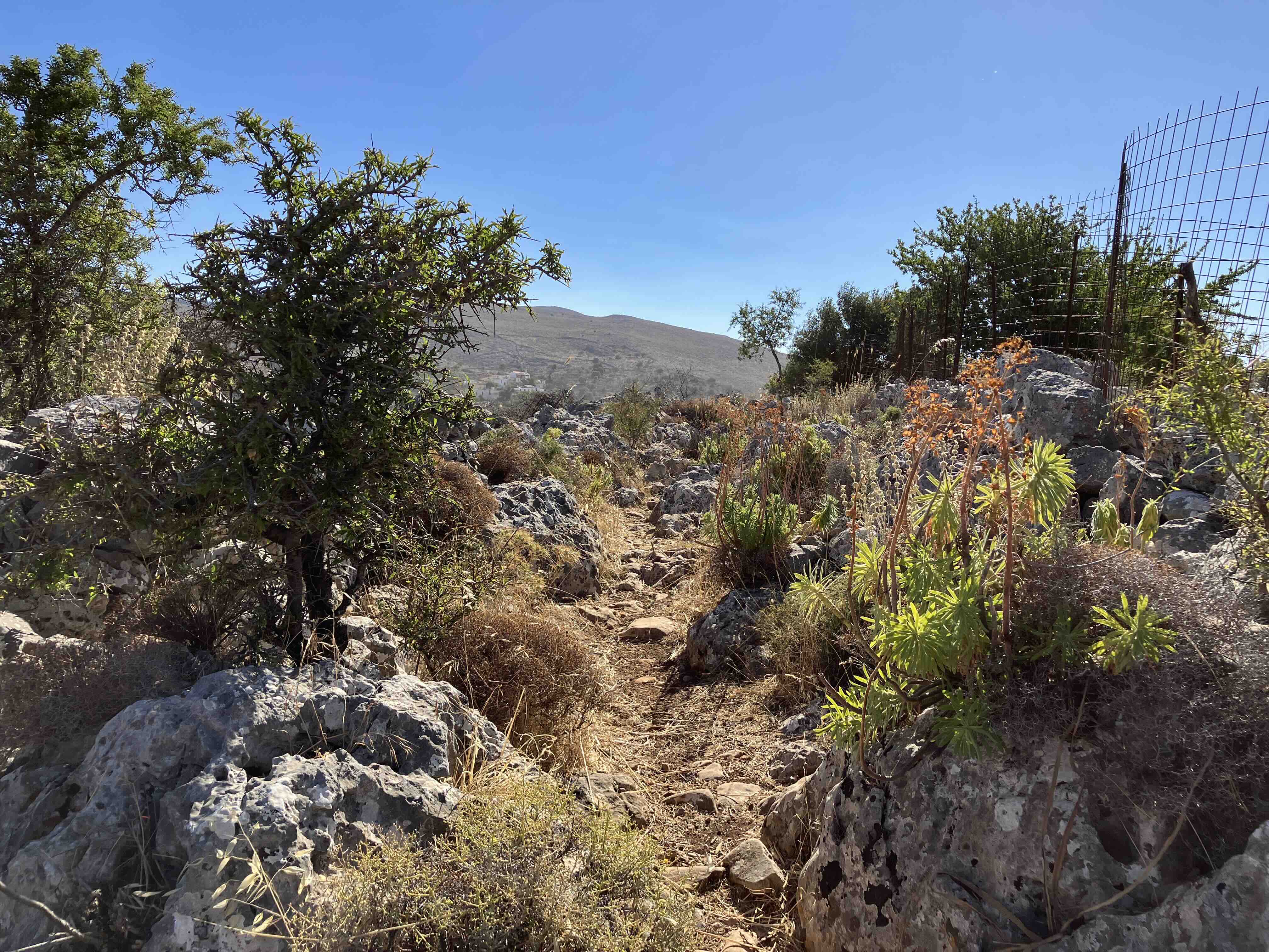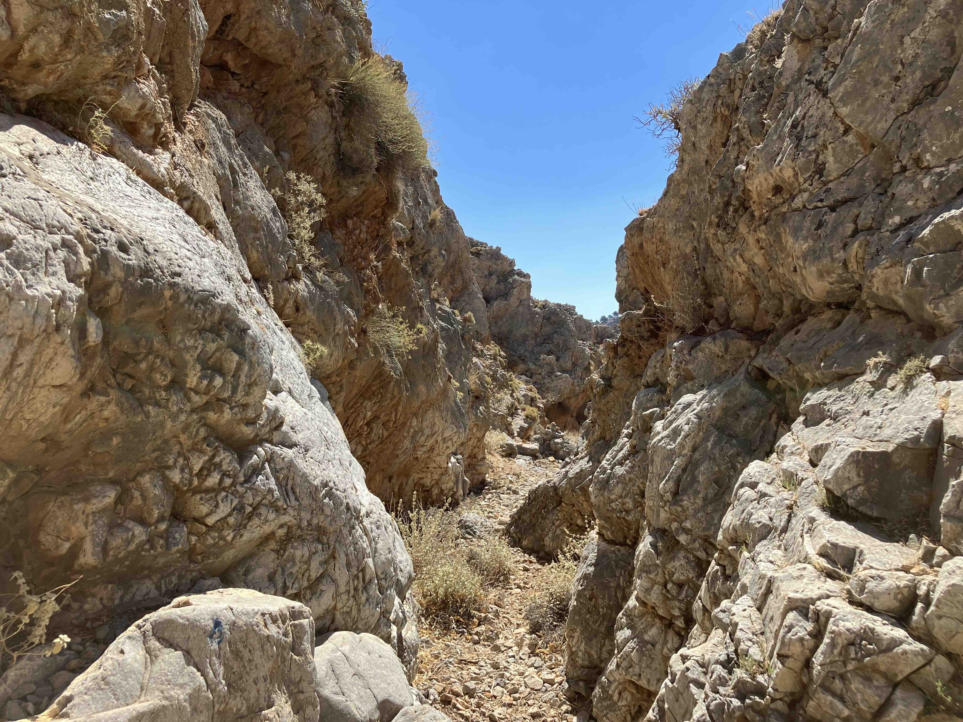 Dieser folgt man geradeaus, zunehmend hangabwärts, vorbei an Autowracks und am Sendemast, bis sich der Ausblick Richtung Chora Sfakion eröffnet. Ab dort wechseln Schotterpiste und alter Kalderimi sich ab. Man quert kurz die Hauptstraße, geht unter der Stromleitung durch und folgt dem kleiner werdenden Weg in die einsame Anopolis-Schlucht.