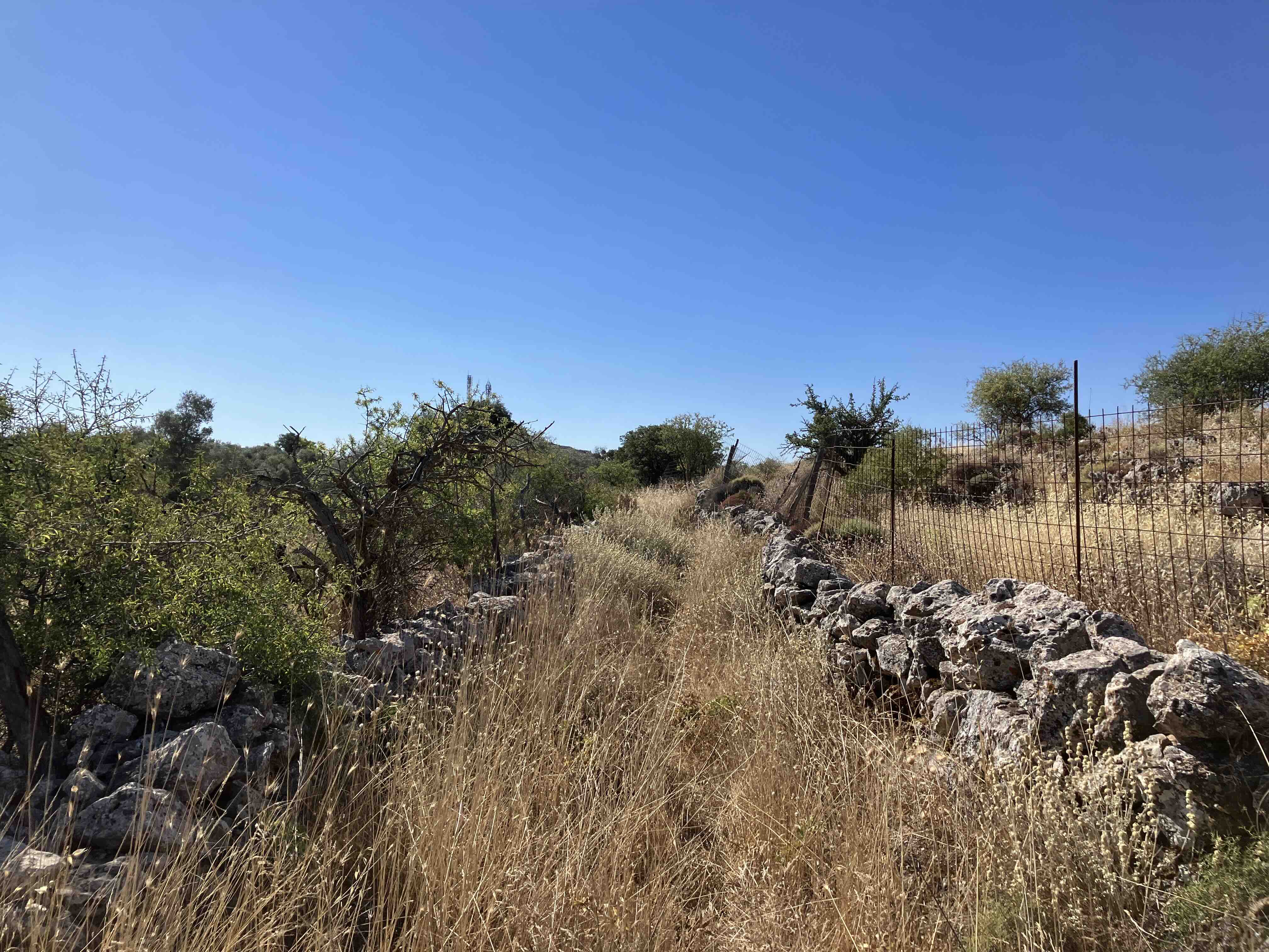Von dort ein Stück die Straße hinunter, die man in der zweiten Kurve gerade aus auf einen alten Kalderimi verlässt. Dieser ist wirklich bezaubernd, auch wenn einige Bereiche hüfthoch mit stachelfreiem (!) Gras bewachsen sind und man sich hier und da etwas durchschlängeln muss. Auch befindet sich ein hartnäckiges Gatter aus Bewehrungsgitter auf dem Weg. Kurz vor seinem Ende verlässt man ihn links Richtung Hauptstraße die man sogleich wieder rechts verlässt und auf eine Nebenstraße einbiegt (Apartments Madares).