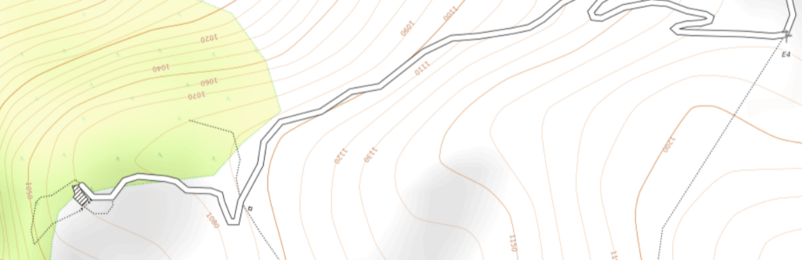 Ich habe den Weg, soweit ich ihn abgegangen bin, bei OpenStreetMap eingezeichnet. Ganz links (schraffiert) Greleska, dann die V-Kurve, an der der Asphalt endet, und ganz rechts der E4-Pfad nach Koustagerako, wie er die Straße verlässt.