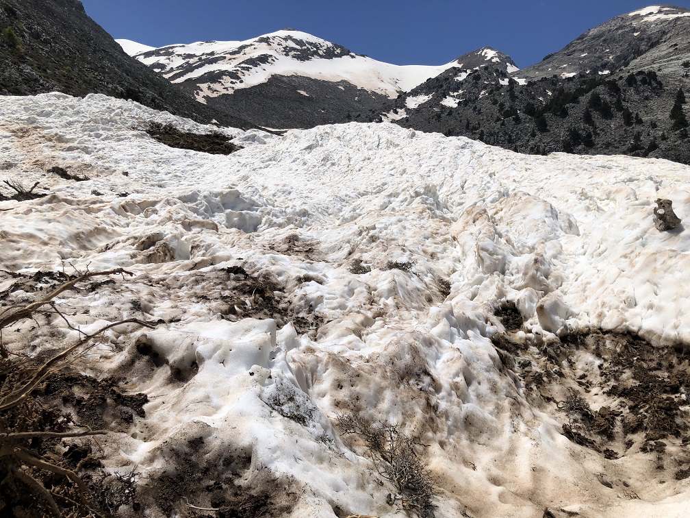 Hier die Lawine von Athimolakos (Tal zwischen Volikas-Refuge und Psari) in 1240m Höhe vom 29.04.2019. Laut dem Hirten, der uns begleitet hat, ist vor Ende Juni keine Weidewirtschaft möglich.