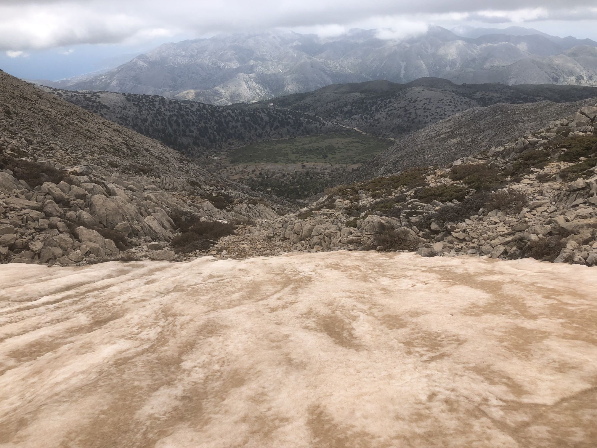 On 8th may I biked from Anopoli to Skafidakia, altitude about 1250m, near Kefala, strenuous two hours almost because of the very bad road and all the stones.There I left my mountainbike and hiked northwards up to Kastro in my trailrunning shoes. No problem to avoid the snowfields by going sometimes left, sometimes right. After three and a half hour I stood on top of Kastro. Blue sky and clouds, almost no wind. For the descent I chose the East-face direction Niato - nice surfing in the snow, like on skis almost. Because of fog, that arouse immediately, it was not that easy to get the orientation. Via Trikoukia and Kali Lakkoi I got to my bike again (the last part of the path is strenuous - hard to find the right way). Conditions in the White Mountains are in my opinion excellent, if you are experienced in walking on snow - instead of loose rocks there are nice snowfields, and you do not sink in in the snow. For steeper slopes it is recommended to take a light ice-axe with you for security. I will for sure climb some other peaks of the Levka Ori in the next days.