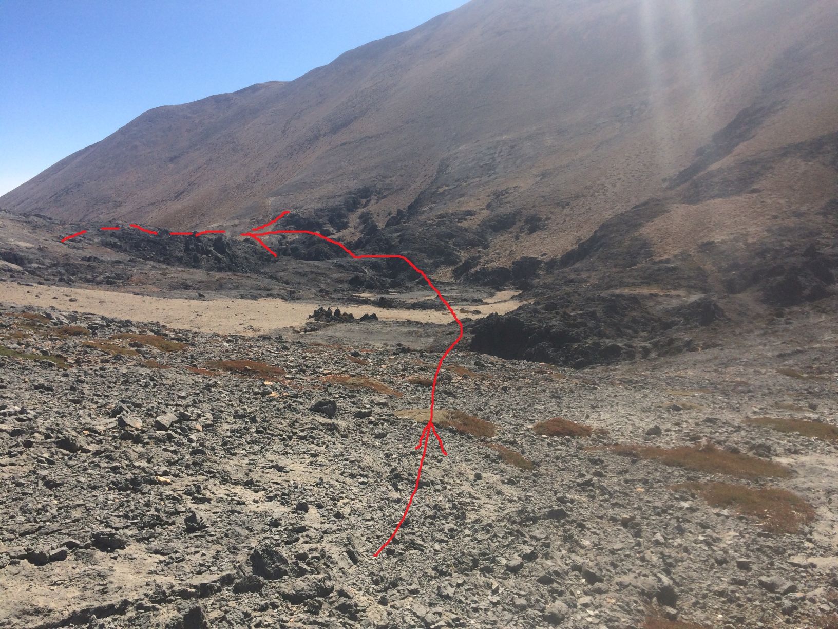 Am 12. Oktober 2016 beging ich mit meiner Freundin Katrin ab der Katsivelihütte den E4-Pfad nach Niato (am Tag vorher sind wir von Krousia über den Zeranokefala-Pfad via Mitato Potamou nach Katsiveli gegangen, inklusive Gipfelbesteigung des Zeranokefala). Auf ca. 1960 m ü M, südöstlich des Gipfels des Mikros Trocharis, verliessen wir aber den Pfad - statt die Höhe haltend bzw. leicht aufsteigend zum Koutala Seli stiegen wir südöstlich haltend tendenziell abwärts ins Mavri Lakkoi runter, weil es dort so verreckt schön und wild aussah. Rauf und runter, den Dolinen immer wieder links ausweichend, dann, südlich des Kastro, ostwärts, auch hier eine Doline nach der andern, diverse Kraxeleien, die nicht immer ganz trivial sind, sorry, wie auf dem E4 auf der anderen Seite des Kastro. Wo es dann flacher wird, zwischen Kastro und Skoutsio (man erreicht hier sowas wie ein ausgetrocknetes Flussbett) meint man, jetzt gehe es gemütlich nur noch das Tal raus - weit gefehlt! Es kommen auch hier noch drei riesige Dolinen mit steilen Abbrüchen, die weit an den rechts liegenden Hang hochreichen, was immer wieder zu kleineren Gegenanstiegen führt, bis man den ersten "schwachen" Punkt in der Klippe findet, wo man einigermassen komfortabel runterkraxeln kann.