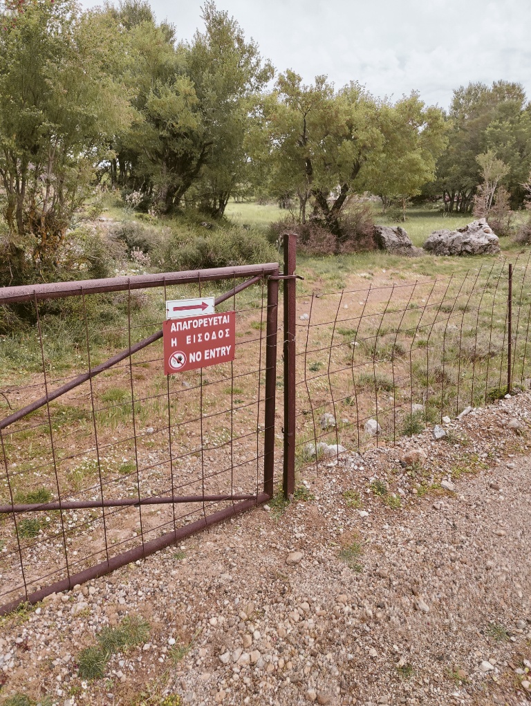 Huh, I've just passed through that area enroute to Askifou. I turned early (from the direction of the tavri refuge) to bypass the meadow, cutting through the small farmyard. The gates as usual were weakly secured with a wire. Arriving at the gate at the descent to Askifou, I found the gate was hanging off its hinges, however the fence panel blocking the gate was only secured with a single wire. I went through and reattached the wire. Only then did I see the 'NO ENTRY/ΑΠΑΓΟΡΕΥΕΤΑΙ Η ΕΙΣΟΔΟΣ' sign