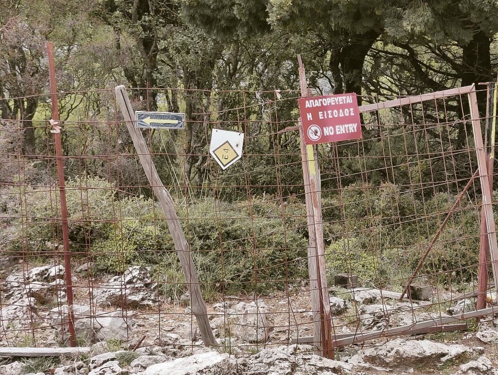 Huh, I've just passed through that area enroute to Askifou. I turned early (from the direction of the tavri refuge) to bypass the meadow, cutting through the small farmyard. The gates as usual were weakly secured with a wire. Arriving at the gate at the descent to Askifou, I found the gate was hanging off its hinges, however the fence panel blocking the gate was only secured with a single wire. I went through and reattached the wire. Only then did I see the 'NO ENTRY/ΑΠΑΓΟΡΕΥΕΤΑΙ Η ΕΙΣΟΔΟΣ' sign