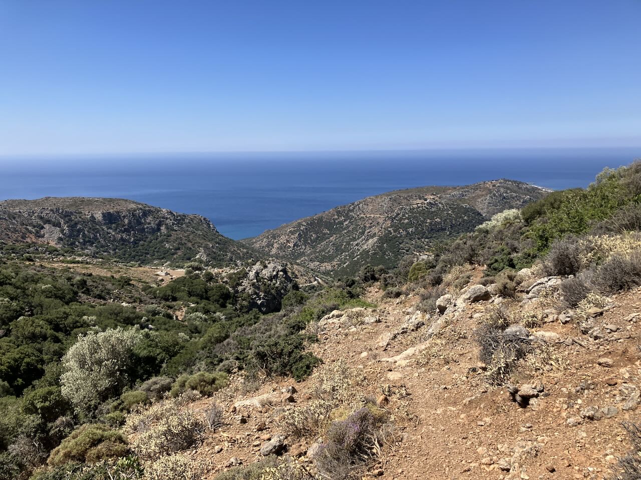 Der Weg führt halbseitig um den Berg herum bis an die Südflanke des Kastri. Ein schroffer Pfad führt den Hang hinunter bis zu der kleinen Häuseransammlung Platanes.