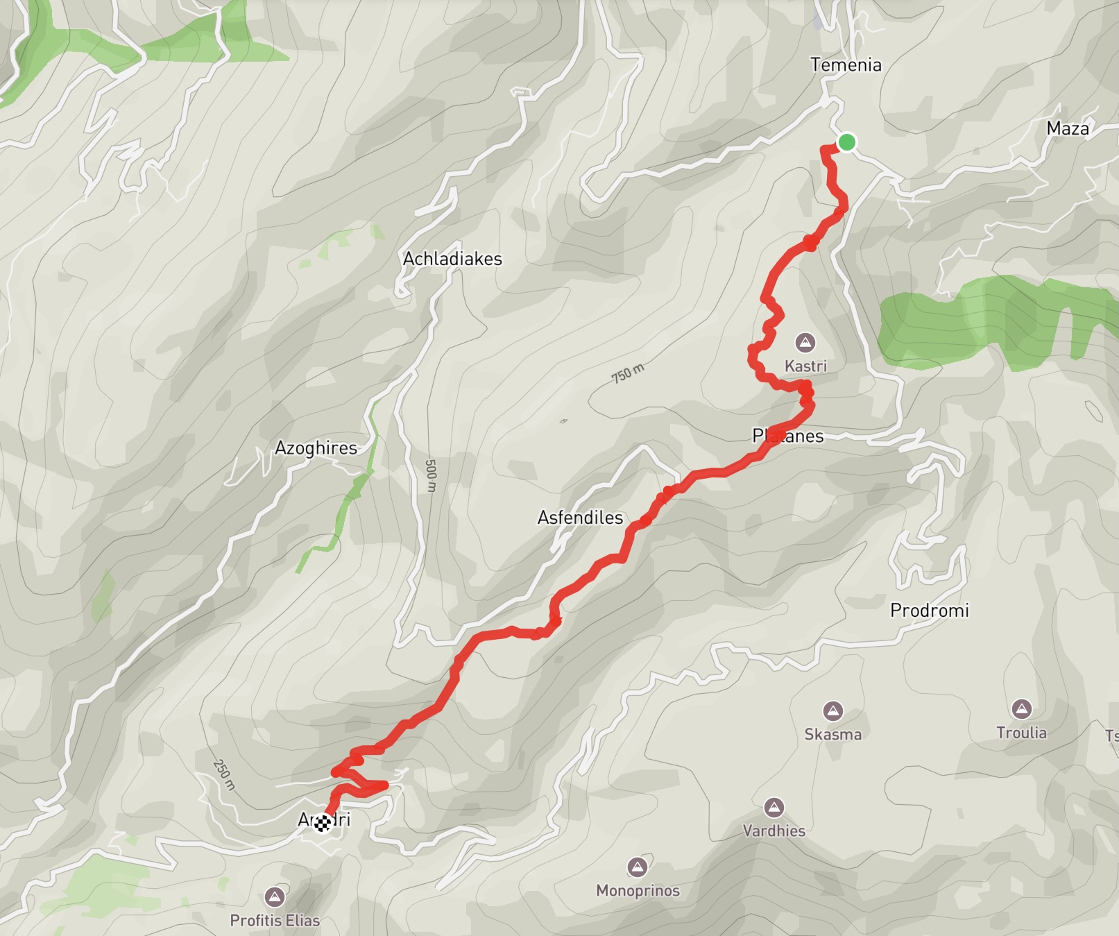 Der Weg beginnt etwas vor dem Ort Temenia an der Hauptstraße bei der Kirche Sotiros Christos. Dort führt eine Straße den Berg hinauf. Die Abkürzungen, die immer wieder auf die Schotterstraße führen sind wenig begangen und teils kniehoch zugewachsen. Ist aber machbar. Man kann aber auch auf der Schotterstraße bleiben.