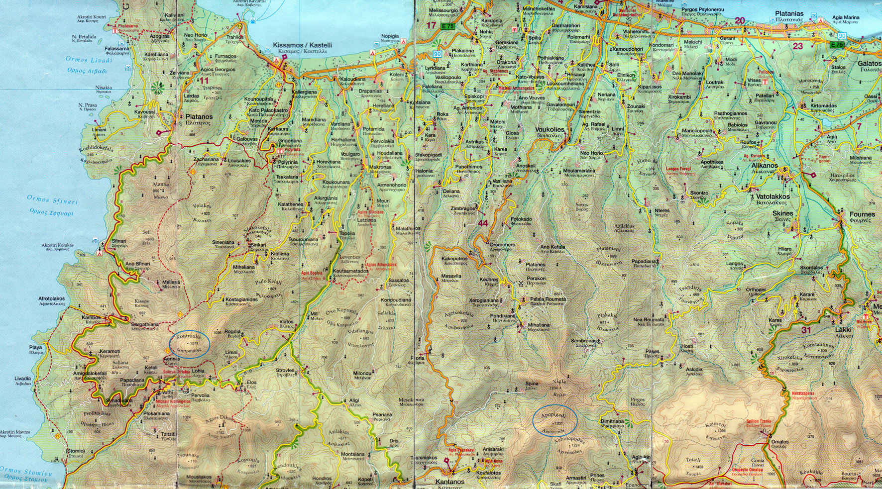 Wanderungen im Bereich des Koutroulis wie auch des Apopigadi sind in Alan Hall: Western Crete (Cicerone Guide, ISBN 1-85284-419-1) enthalten, der Aufstieg auf beide Berge aber wohl nicht. Falls Interesse besteht, könnte ich dir die entsprechenden Seiten kopieren oder scannen (man kann aber auch in Google in das Buch schauen). In sonstiger Literatur habe ich leider nichts gefunden, was uns weiterhelfen würde.