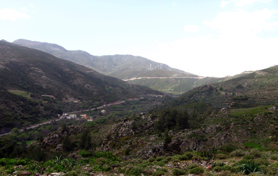 zu gehen sein. Am Bild, das ich auf dem Weg von Agia Irini nach Omalos gemacht habe, dürfte links der Apopigadi sein. Wo die Windräder stehen, könnte der Steig beginnen.