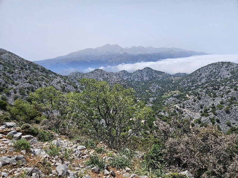 Da die Wolken aber ca 200m über mir hingen hielt ich das dann für keine gute Idee in weglosem Gelände ohne Sicht zu laufen und bin stattdessen der Schotterstraße nach Westen gefolgt. Vor dem oben schon von kv fotografierten Haus traf ich den Besitzer, der einigermaßen irritiert erschien, dass ich noch bis Askifou wollte und nicht nach Alikambos